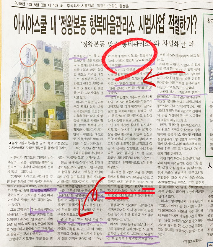 시흥저널은 지난 4월 8일자 신문발행을 통해 ‘정왕본동 행복마을관리소(정확한 사업명: 경기행복마을관리소)’ 시범사업 위치 선정에 대한 문제를 제기하면서 기사의 결정적인 오류를 범했다.