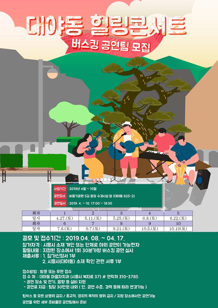 오는 4월 27일부터 비둘기공원5길 광장 수경시설 앞(대야동 625-2)에서 ‘2019 대야동 힐링콘서트‘ 가 개최된다.