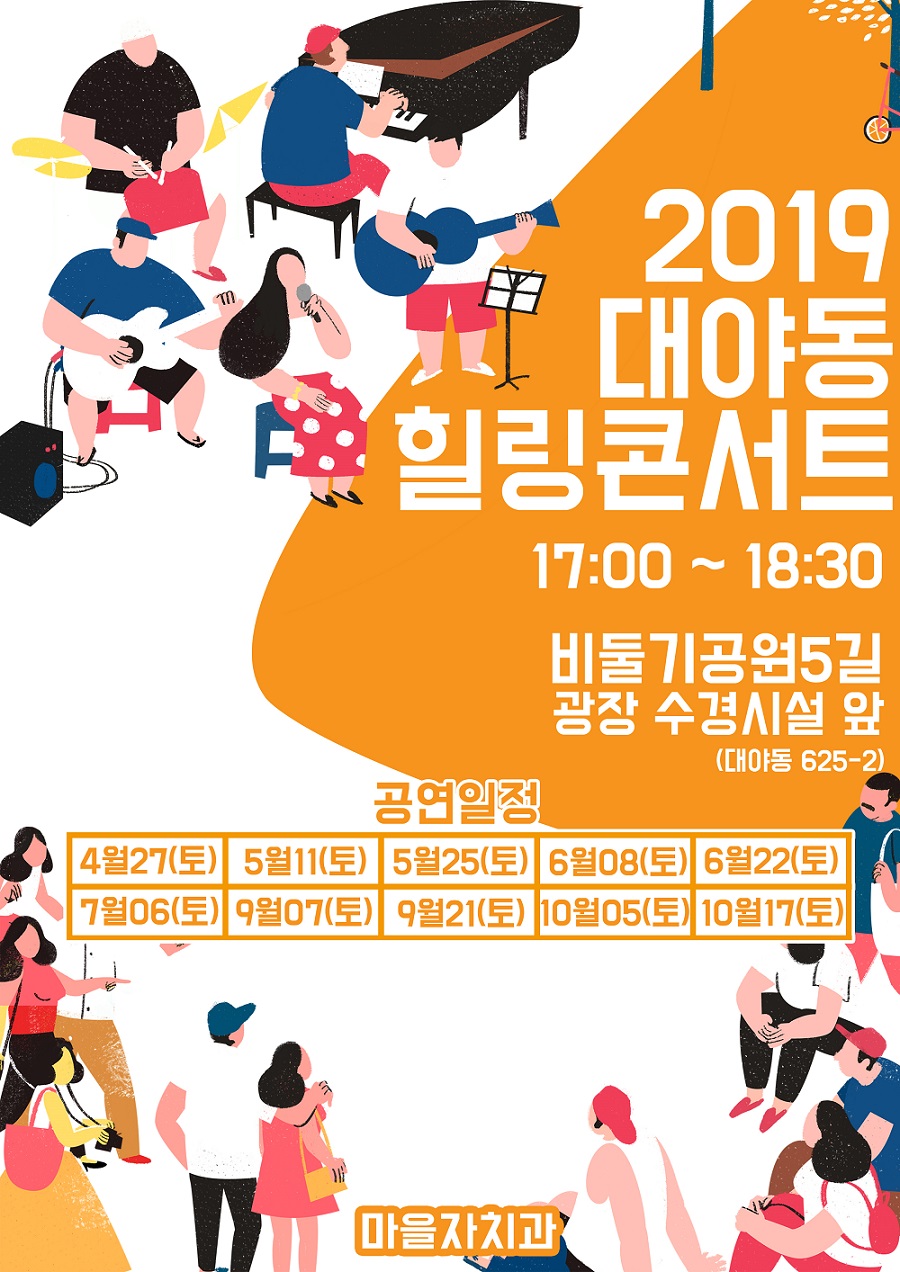 ‘도심 속에서 즐기는 소소한 공연‘을 주제로 대야동 마을자치과(과장 정대화)에서 진행한 ’2019 대야동 힐링콘서트‘가 4월 27일 오후 5시 대야동 롯데마트 시흥점 옆 수경시설에서 첫 공연의 막을 올렸다.