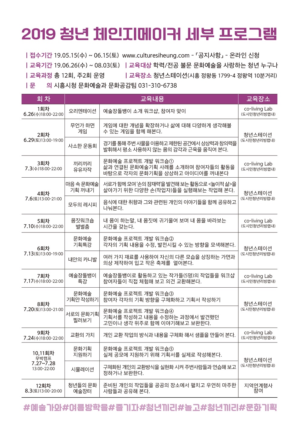 교육기간은 6월 26일부터 8월 3일까지 매주 수요일과 토요일, 주 2회 교육하며 정왕동 도시민청년리빙랩 청년스테이션에서 진행한다. 교육과정은 ▲문화기획 전문가특강 ▲예술장돌뱅이 워크숍 ▲문화예술 기획안 작성하기 등 총 12회로 문화예술 기획에 대한 이론교육과 실습과정으로 구성되어있다.
