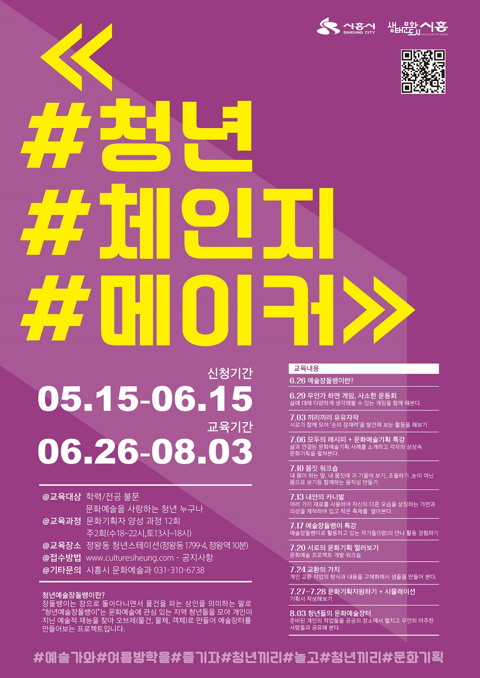 교육기간은 6월 26일부터 8월 3일까지 매주 수요일과 토요일, 주 2회 교육하며 정왕동 도시민청년리빙랩 청년스테이션에서 진행한다. 교육과정은 ▲문화기획 전문가특강 ▲예술장돌뱅이 워크숍 ▲문화예술 기획안 작성하기 등 총 12회로 문화예술 기획에 대한 이론교육과 실습과정으로 구성되어있다.