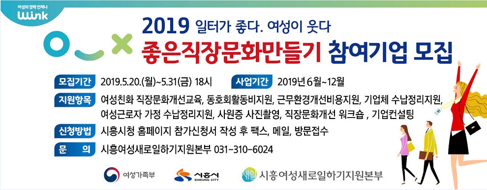 시흥시는 2019년에도 5개 기업을 지원할 예정이며, 여성 근로자가 최소 3명 이상인 관내 20인 이상 300인 미만 사업장이면 누구나 신청할 수 있다. 프로젝트에 선정된 기업은 CEO 및 중간관리자 교육부터 여성 근로자 건의사항 수렴을 위한 여성 근로자 간담회, 동호회 활동비, 근무환경개선, 소통·공감 워크숍 등 직원이 함께 참여할 수 있는 프로그램을 지원받을 수 있다.