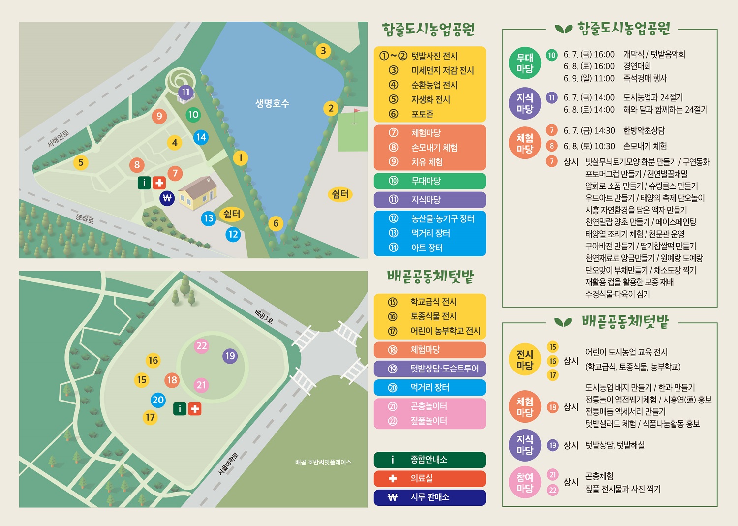 이번 행사는‘나는 도시농부다’라는 주제로, 식물 생육의 3요소인 물, 흙, 태양을 담은 이야기가 있는 한마당으로 구성했다. 개막식은 7일 오후 4시 주 무대인 함줄도시농업공원 잔디광장에서 진행된다.