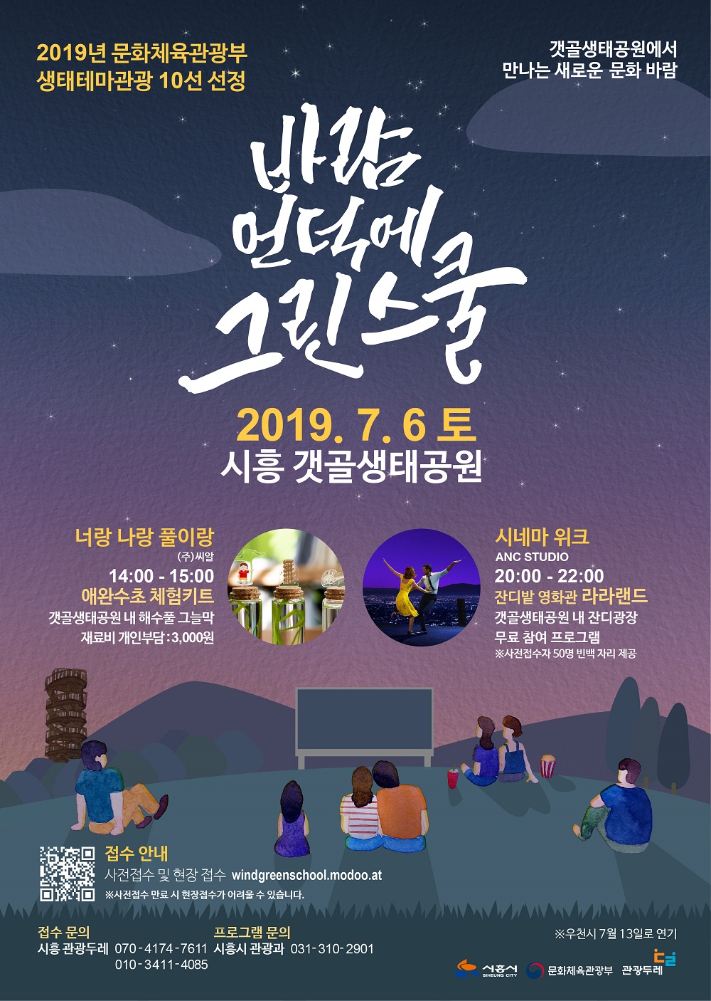 시흥시(시장 임병택)는 5월부터 11월까지 갯골생태공원에서 2019년 문체부 생태테마관광 10선 선정 사업인 ‘갯골생태공원, 바람언덕에 그린 스쿨’ 프로그램을 운영하고 있다. 곧 다가올 7월 첫째 주 토요일(7월 6일)에는 여름밤 바람을 맞으며 즐거운 저녁 시간을 맞이할 수 있도록 야외 영화 상영회가 준비되어 있다.