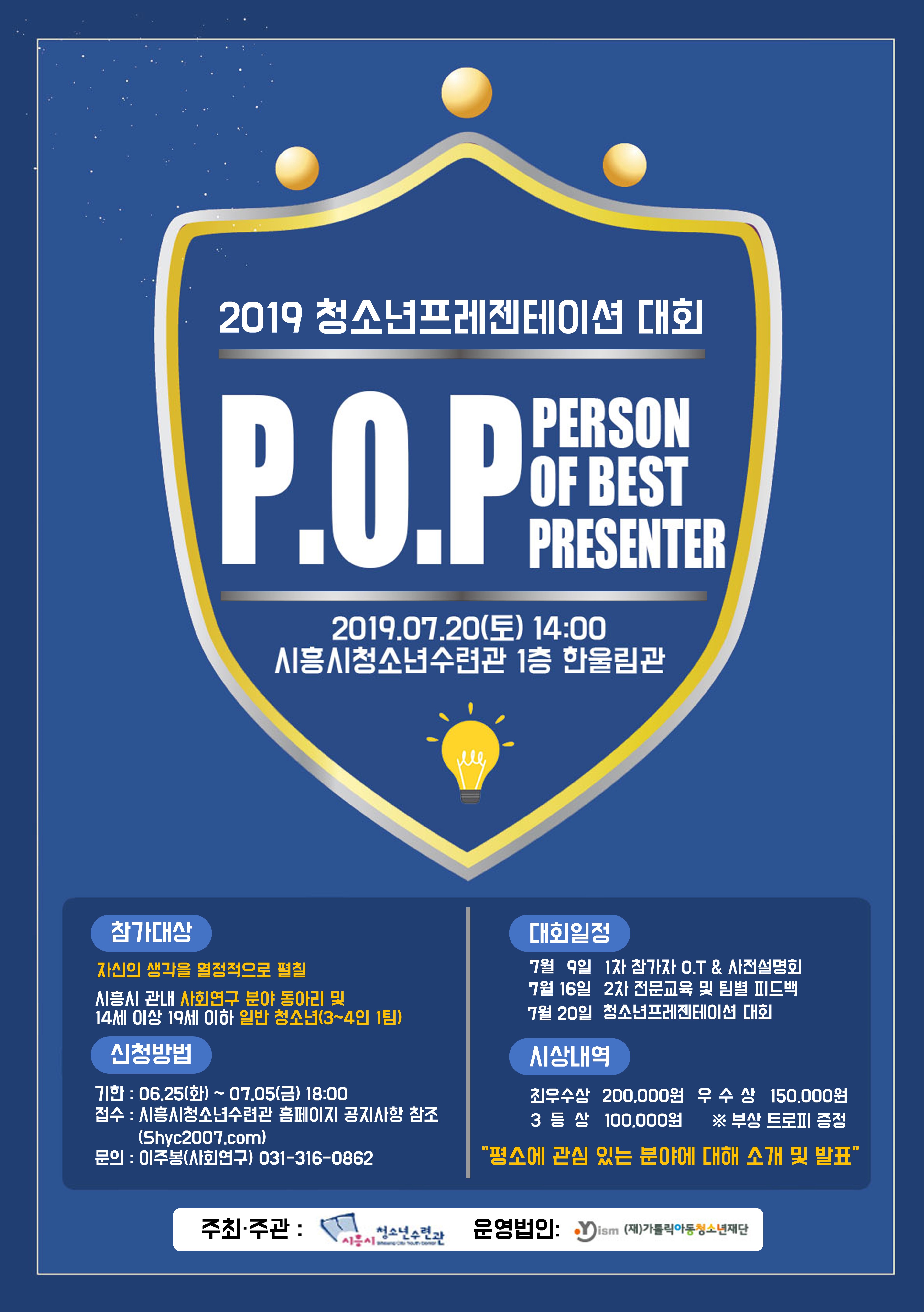 시흥시청소년수련관이 주최하는 ‘2019 청소년프레젠테이션 대회(P.O.P)’는 5개청소년활동대전의 하나로, 자기표현능력 및 다양한 영역의 정보공유와 전문성 향상을 목적으로 올해 처음 진행하게 되었다.