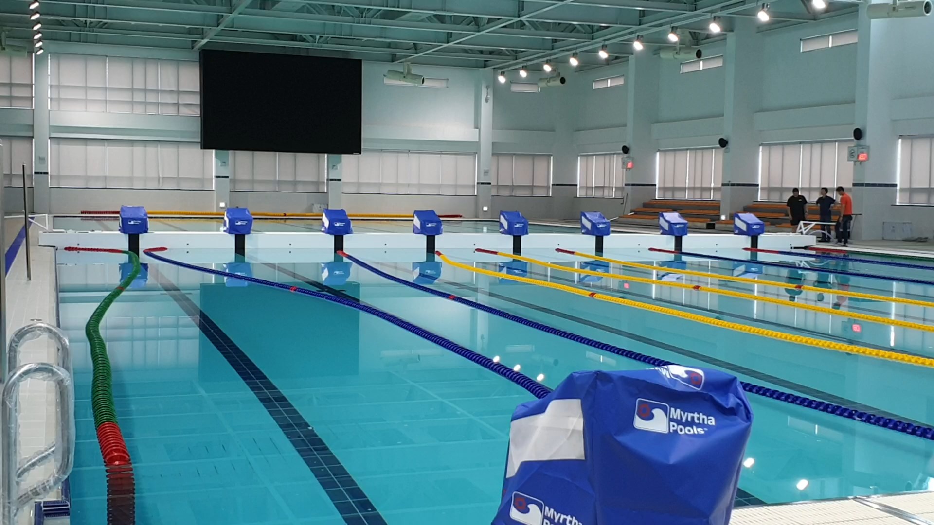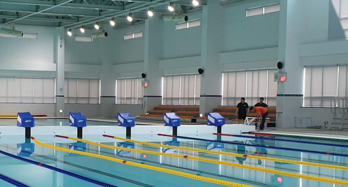 수영장에는 시설관리공단에서 말한 것처럼 스타트 대가 안착된 벌크헤드(일명 가벽)가 가로 방향으로 설치되어 있었다. 50미터를 반으로 잘라 놓은 형태였다. 플로팅 자동수위조절장치는 입구 쪽에서 왼쪽(사진에서 전광판 쪽) 25미터 구간에만 설치되어 있었다. 자동수위조절장치가 있는 부분은 수위가 0에서 FL-1.8M까지 조절이 가능하다. 벌크헤드가 세로 분리형이 아니고 가로형이다 보니 50미터 레인을 몇 개만 따로 운영하긴 불가능한 구조였다. 다시 말해 50미터로 레인 변경 시, 8 레인 모두가 수심 1.8미터가 된다.