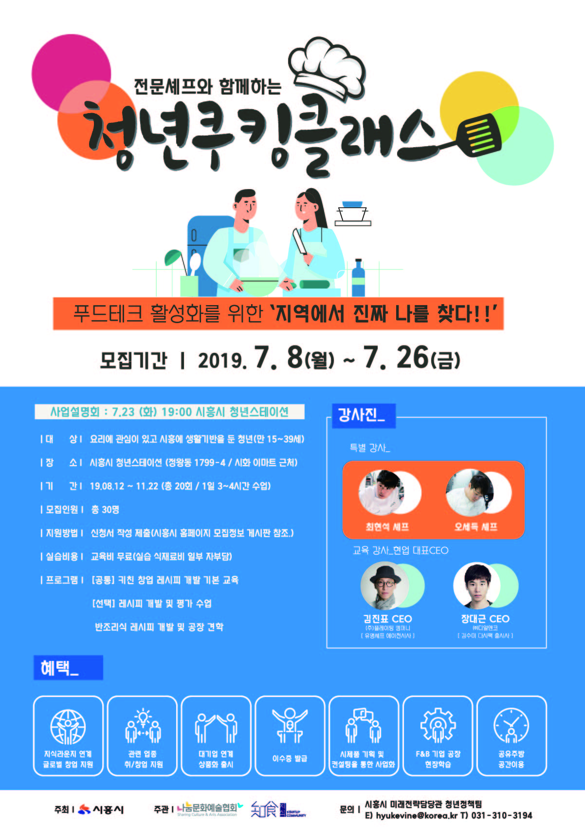 시흥시(시장 임병택)는 시흥 청년들의 실업 문제 해결책 마련의 일환으로 (사)나눔문화예술협회(이사장 유현숙)와 함께 ‘전문 셰프와 함께하는 청년 쿠킹 클래스’를 운영한다.