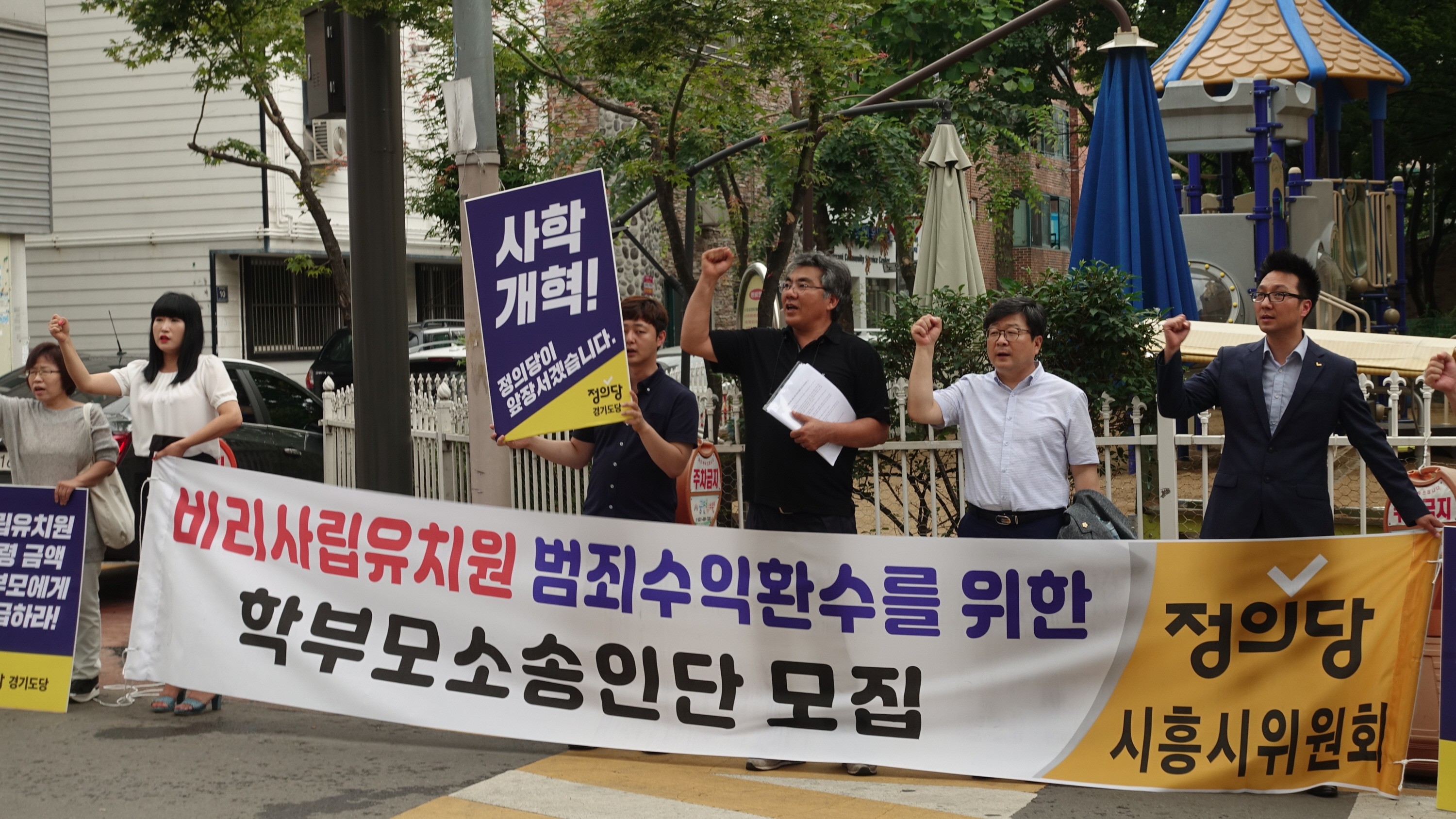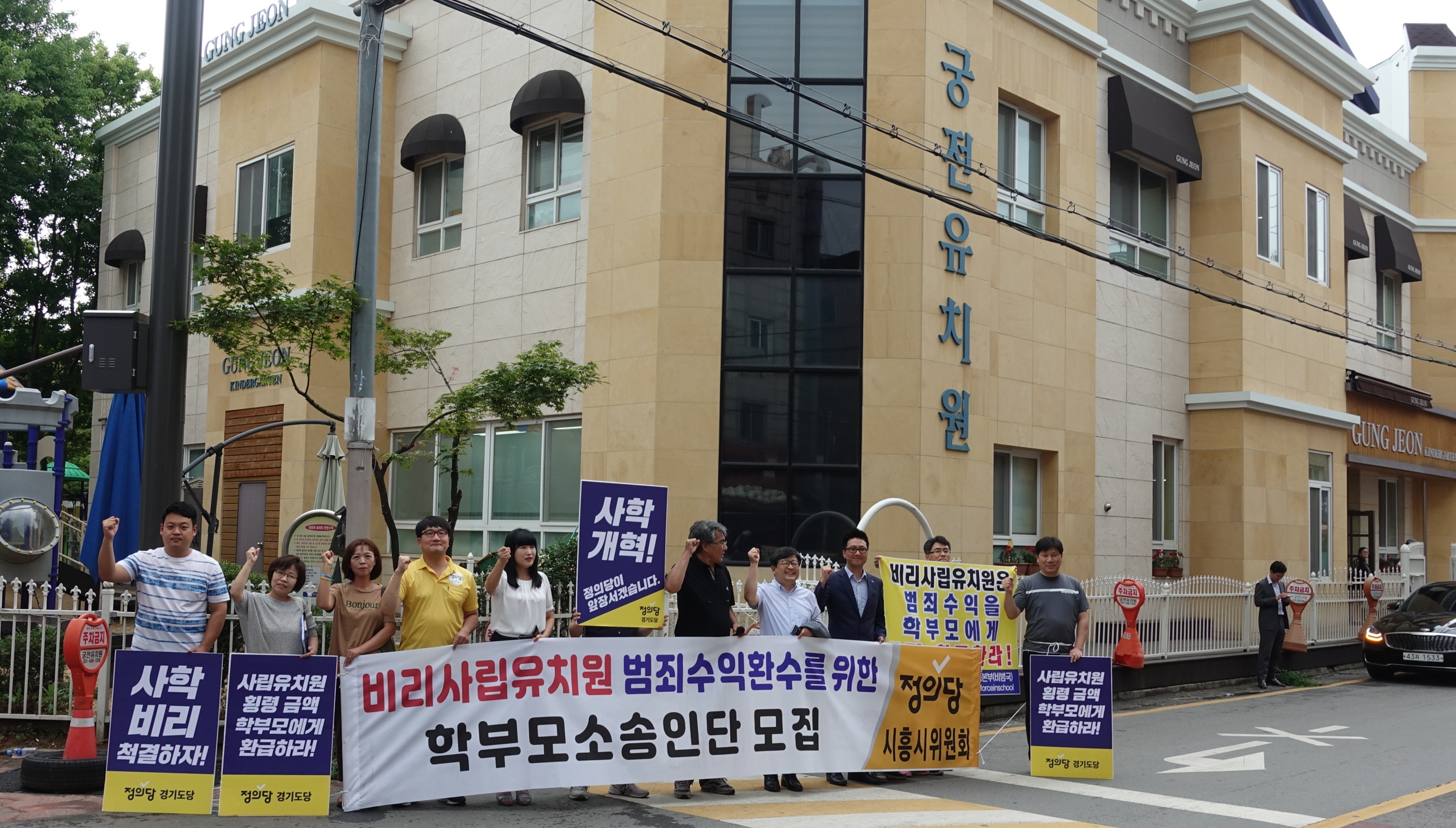 정의당 경기도당과 시흥시위원회가 24일 오후 3시, 정왕본동에 위치한 궁전유치원 앞에서 ‘횡령 금액을 학부모들에게 즉각 반납하라’며 규탄대회 집회를 열었다.