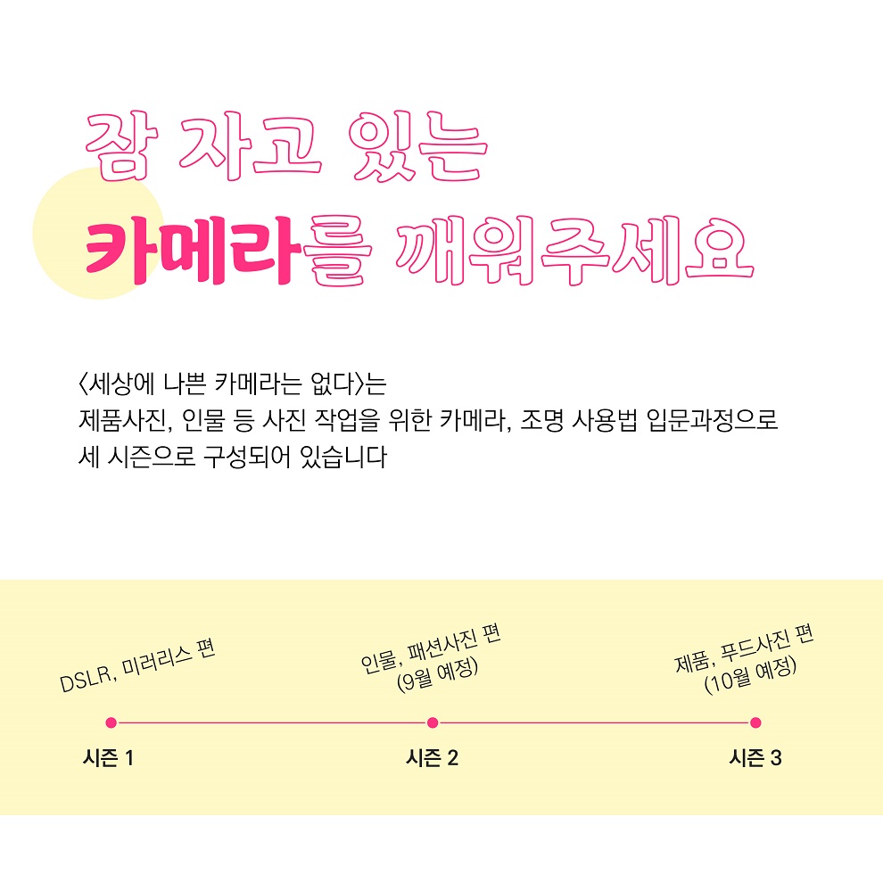 첫 번째 시즌은 DSLR, 미러리스 편이다. ‘잠자고 있는 카메라를 깨워주세요’라는 슬로건을 바탕으로 청년들이 정확한 카메라 사용법을 익혀 효과적으로 활용할 수 있도록 구성되어 있다. 시즌 2. 인물·패션사진 편은 9월, 시즌3. 제품·푸드사진 편은 10월에 진행될 예정이다.
