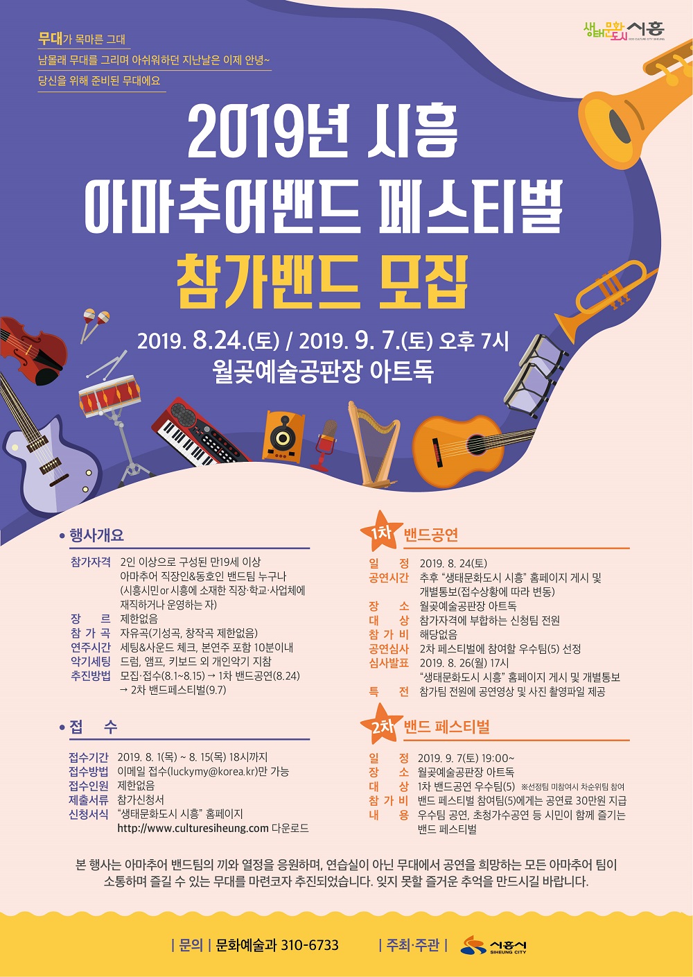 시흥시(시장 임병택)에서는 관내 아마추어밴드의 끼와 열정을 응원하며 아마추어 밴드팀이 소통하며 즐길 수 있는 무대를 마련하기 위해 ‘2019 시흥 아마추어밴드 페스티벌’을 개최하고 오는 8월 1일부터 15일까지 보름간 참가자를 모집한다.