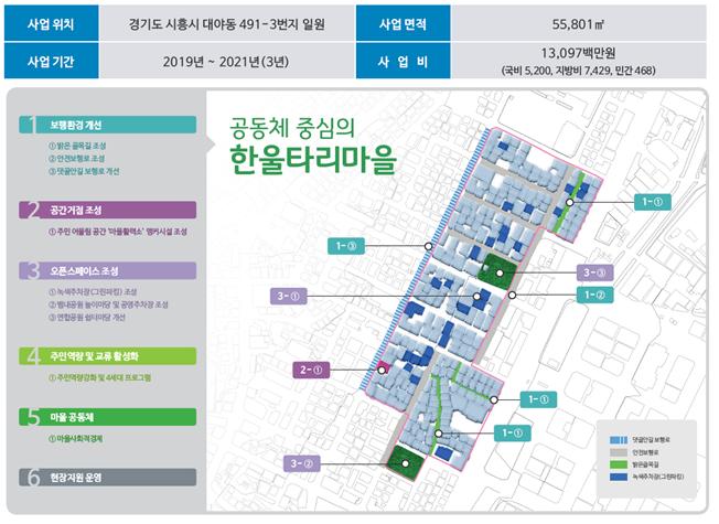 시흥시 대야동 491-3번지 일원의 햇살가득 한울타리마을은 2011년 뉴타운 해제 주민모임, 2012~2013년 주민 공동체프로그램, 2014~2015년 도시재생대학, 2015년 희망마을만들기 등 그간 다져진 주민 자치력을 토대로 2017년에는 경기도 맞춤형 정비사업을 통해 마을계획을 수립했다.
