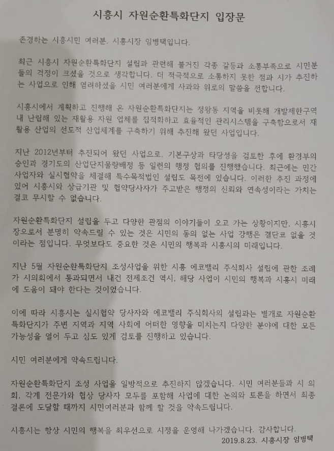 임 시장은 입장문에서 “(사업에 대해)적극적으로 소통하지 못한 점과 시가 추진하는 사업으로 인해 염려하셨을 시민 여러분에게 사과와 위로의 말씀을 전한다.”며, “자원순환특화단지는 2012년부터 추진해 오던 사업으로 기본구상과 타당성 검토, 환경부 승인과 경기도 산업단지 물량배정, 최근에 이루어진 민간사업자와 실시협약 체결 등 이런 모든 행정 협의와 절차가 행정의 신뢰와 연속성이 맞닿아 있어 가치를 무시할 수 없다.”라고 행정부의 입장을 담아 먼저 설명한 뒤,
