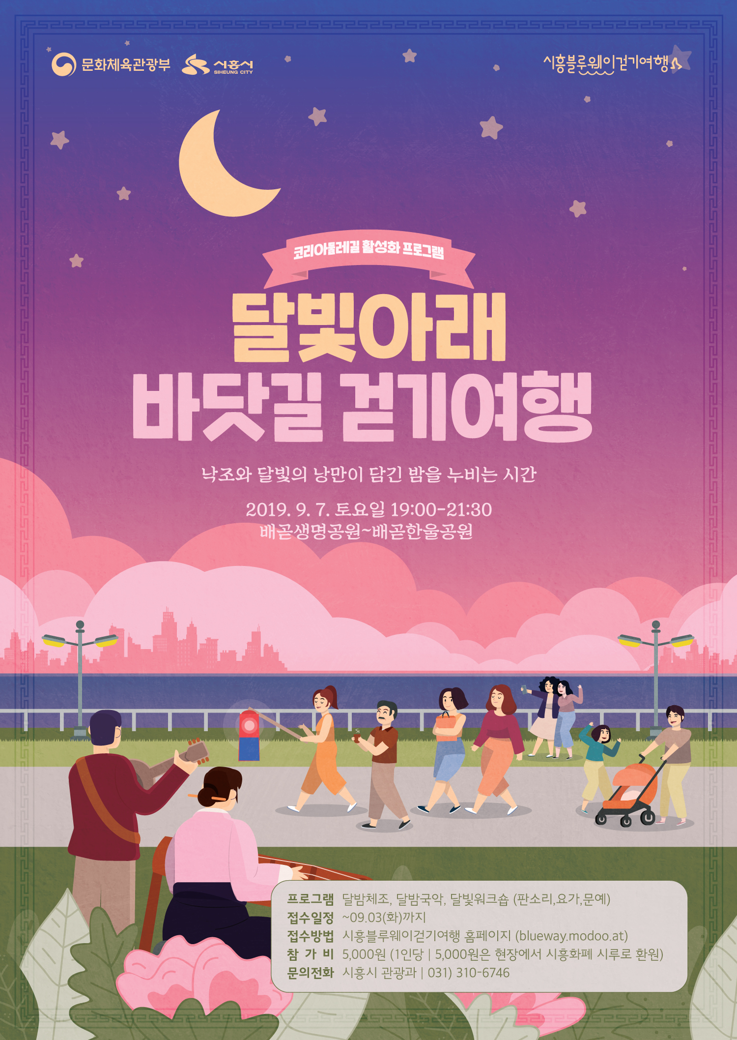 시흥시는 9월 7일 오후 7시부터 오후 9시 30분까지 배곧생명공원과 배곧한울공원에서 「달빛아래 바닷길 걷기여행」을 개최한다.