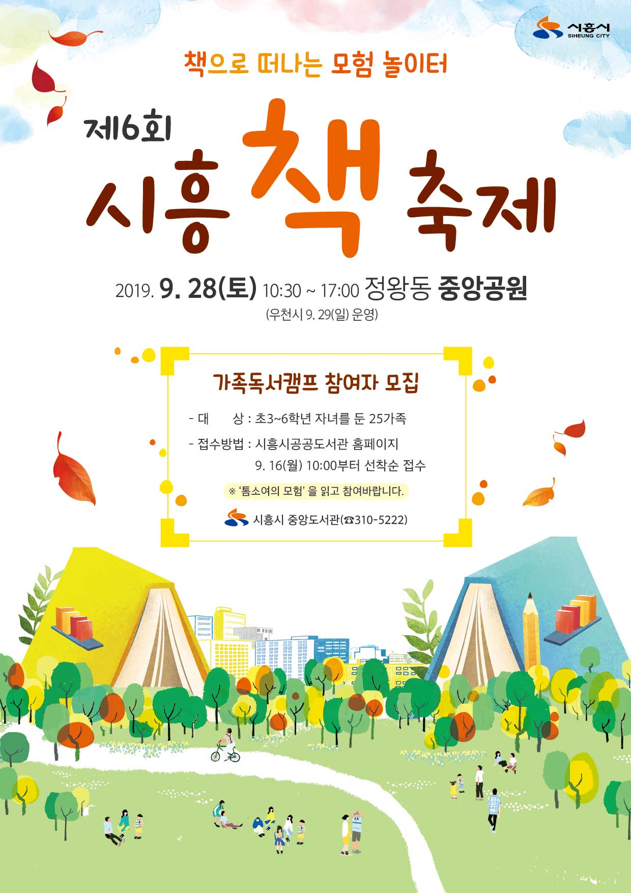 시흥시중앙도서관(관장 김경남)이 9월 28일 10시 30분부터 17시 30분까지 정왕동 중앙공원에서 제6회 시흥 책축제를 개최한다. 책 축제에는 공공도서관, 작은도서관, 교육지원청 및 학교도서관, 학생동아리, 시민독서동아리 등 43개 기관이 시민의 문화 향유와 독서문화 확산을 위해 함께 참여한다.
