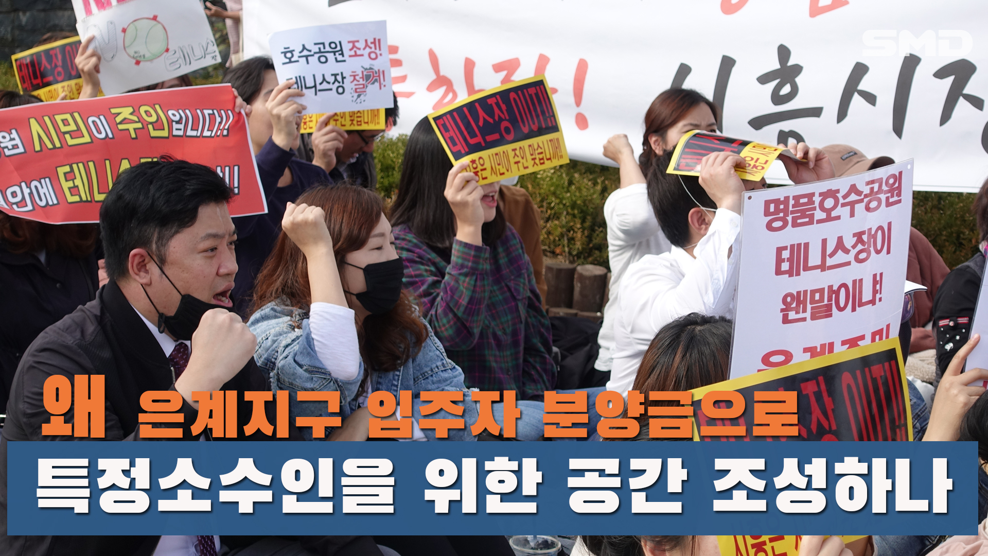 “두달 전에 호수공원 주변에 공사를 하길래 처음에는 땅을 다지는 것인 줄 알았다. 거긴 녹지 지역인데 아스팔트를 깔길래 이상하다 싶어 파고들었더니 그렇게(테니스장 조성) 진행되고 있었다. 나는 15년 10월에 은계지구 첫분양 받고 입주했다. 당시에 이런 얘기 들은 적도 없었고 지구 계획도에는 백지(녹지)로 되어 있었다. 기존의 테니스장은 시흥시에서 사유지를 임대해 사용하던 곳이었다. 테니스협회 회원들을 위한 공간을 만들려면 이에 대한 예산편성을 해서 다른 사유지에 조성해야 한다. 은계지구 입주자들이 낸 분양금으로 만든 공유공간에 6미터 팬스로 둘러쳐진 특정소수를 위한 공간을 조성하는 것은 숟가락 얻는 일이다. 절대 수용할 수 없다. 아스팔트 깔았으면 어린이가 놀 수 있는 놀이터라든지, 롤러스케이트장이라든지 누구나 이용할 수 있는 시설로 바꾸어야 한다. 그것이 어렵다면 다시 녹지로 조성 해야 한다.”