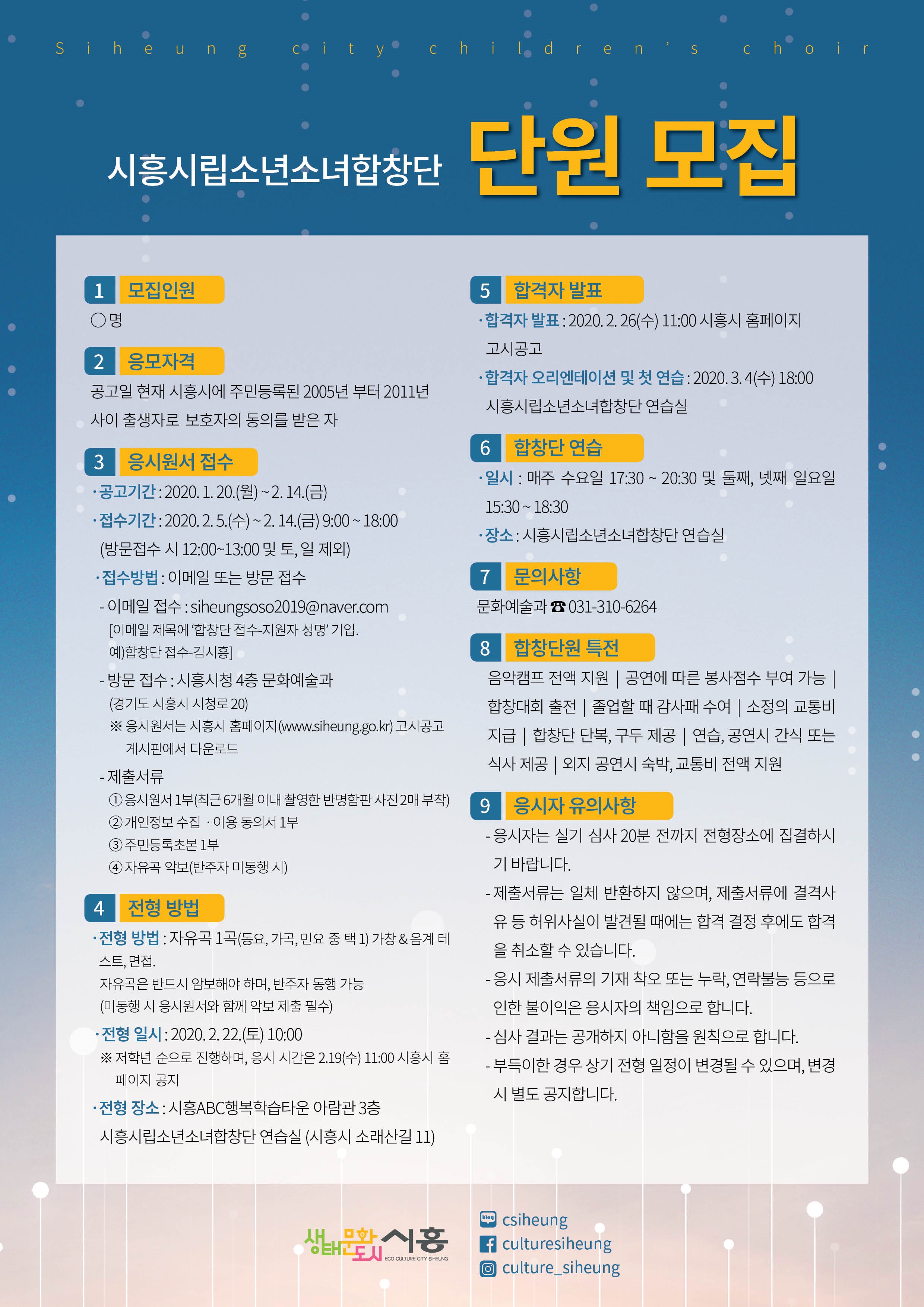 전형방법은 자유곡 1곡 가창 및 음계테스트와 면접이며, 심사는 2월 22일 10시부터 ABC행복학습타운 아람관 3층 시흥시립소년소녀합창단 연습실에서 진행된다.