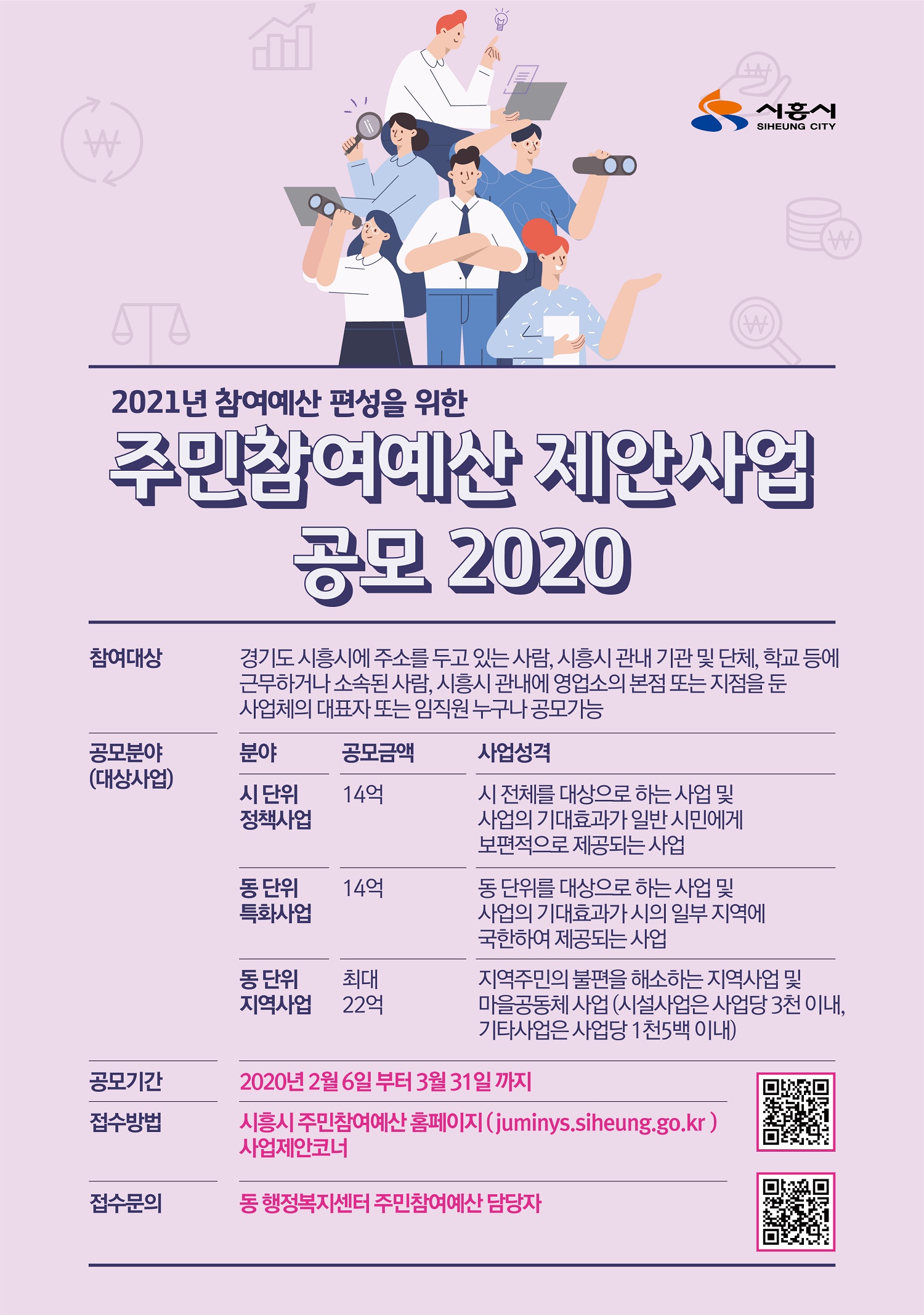 시흥시(시장 임병택)는 시민의견을 수렴해 시민들이 정한 우선순위에 따라 2021년 예산의 일부를 편성하는 2020년 시흥시 주민참여예산 제안사업을 2월 6일부터 3월 31일까지 두 달간 공개모집한다.