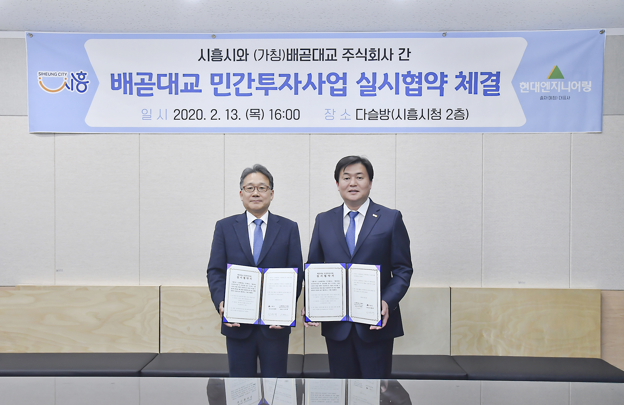 시흥시는 13일 오후 4시 시흥시청 2층 다슬방에서 사업시행자인 (가칭)배곧대교 주식회사와 (가칭)배곧대교 건설사업 실시협약을 체결했다. 이날 협약에는 임병택 시흥시장과 김창학 현대엔지니어링 대표이사가 참석했다.