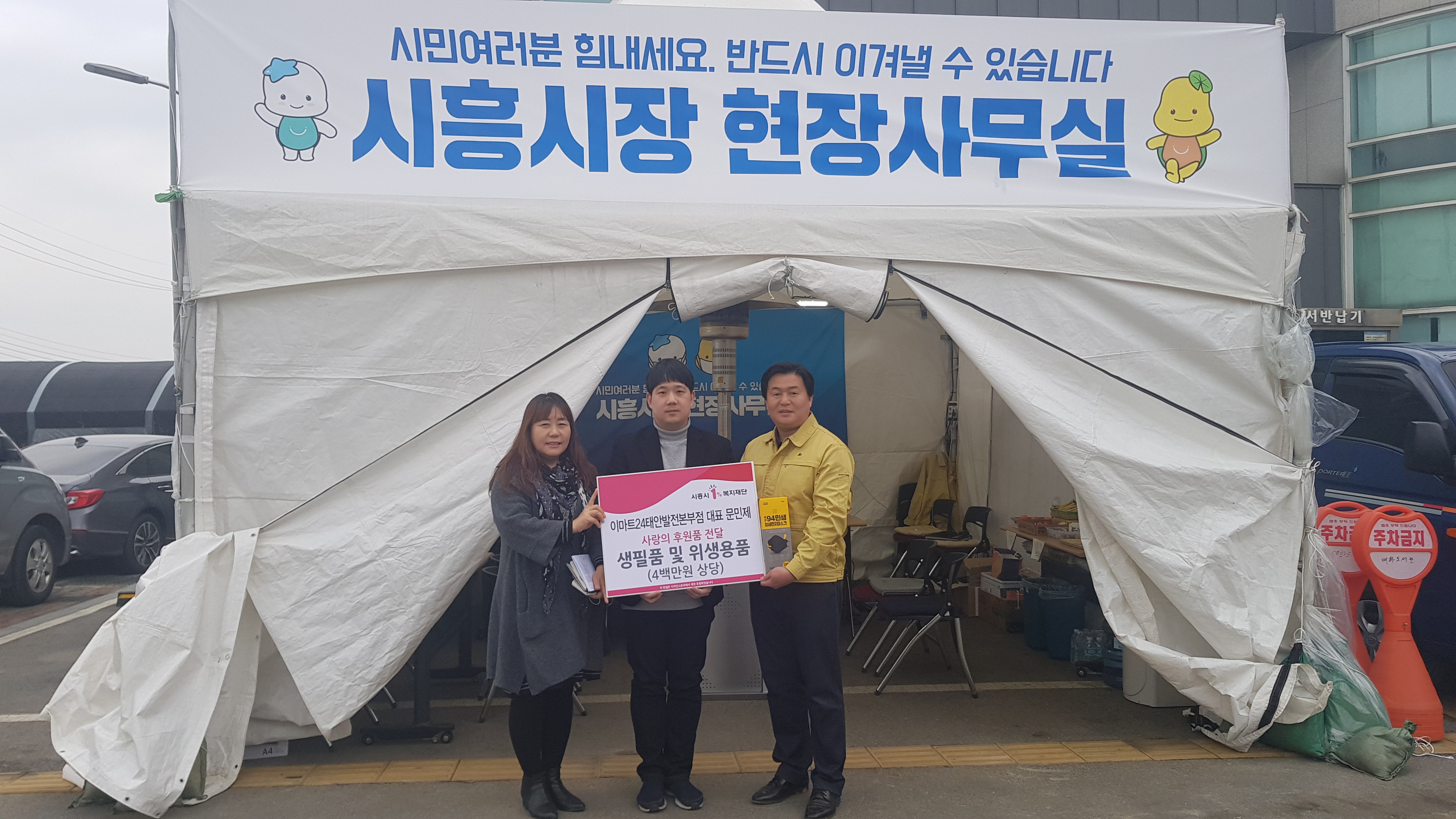 농협은행 시흥시지부에서는 코로나19에 도움이 됐으면 한다며 마스크(KF-94) 1만5,000장과 백미(5kg) 400포를 기부했다. CNS코리아는 손소독제(60ml) 2,550개와 소독제(4L) 100개를 기부했고, TG코리아는 방진용 마스크 1만개를 기부해 7일 수령할 예정이다. 기부된 위생용품은 관내 행정복지센터에서 저소득층 및 취약계층에게 배부할 계획이다.