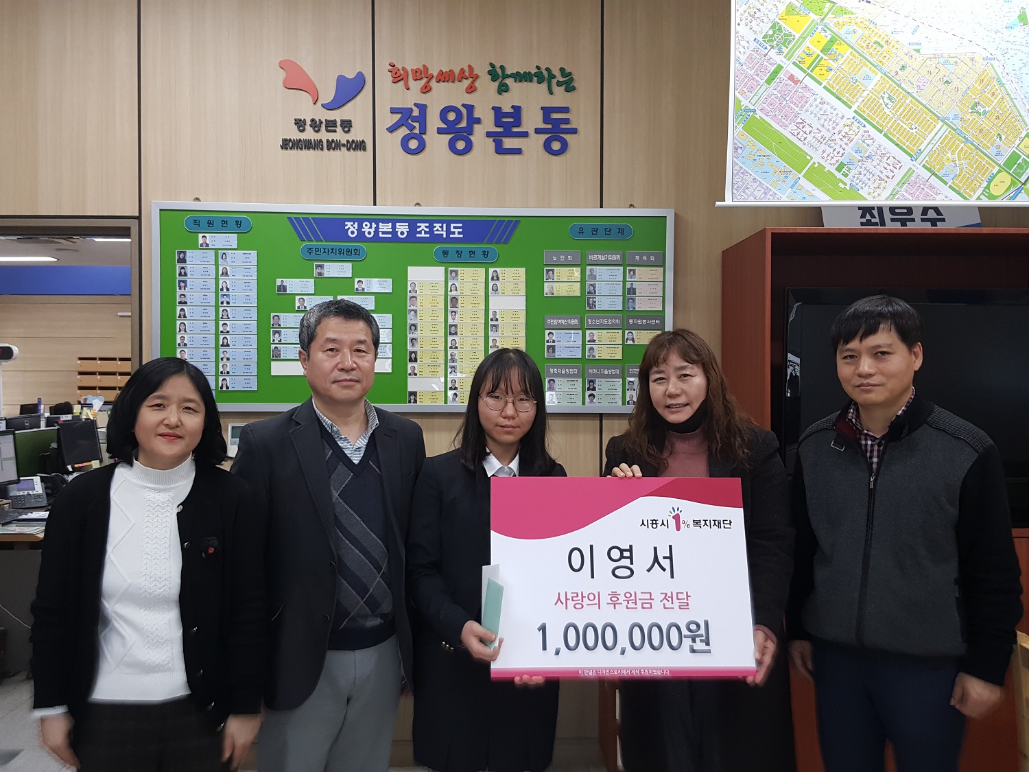 이번에 기탁한 100만원은 시흥시1%복지재단을 통해 코로나19로 어려움을 겪고 있는 정왕본동 내 자녀가 있는 저소득 가정들에게 지정기탁 될 예정이다.