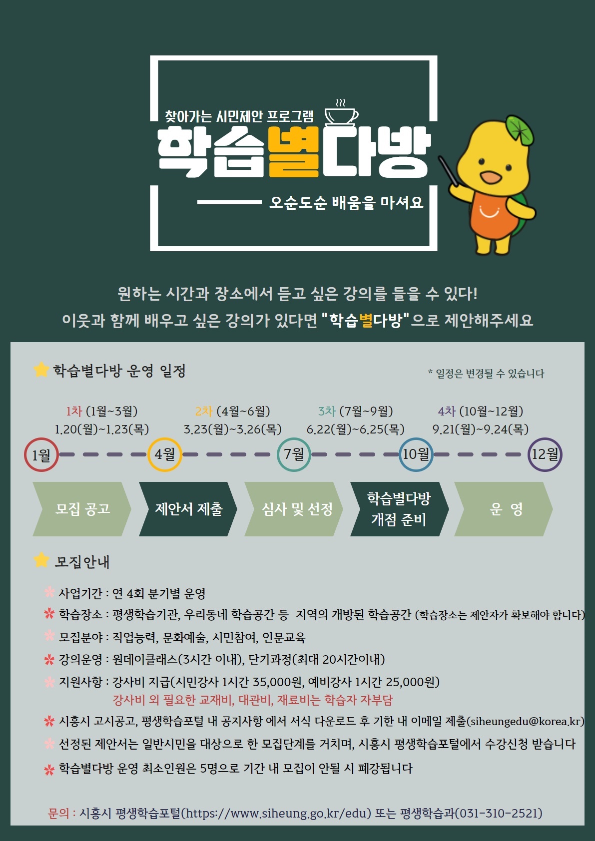 시흥시(시장 임병택)는 학습자들이 원하는 시간과 장소로 찾아가는 시민맞춤형 평생교육 서비스인 「학습별다방」2분기 제안서를 오는 3월 23일부터 26일까지 모집한다.