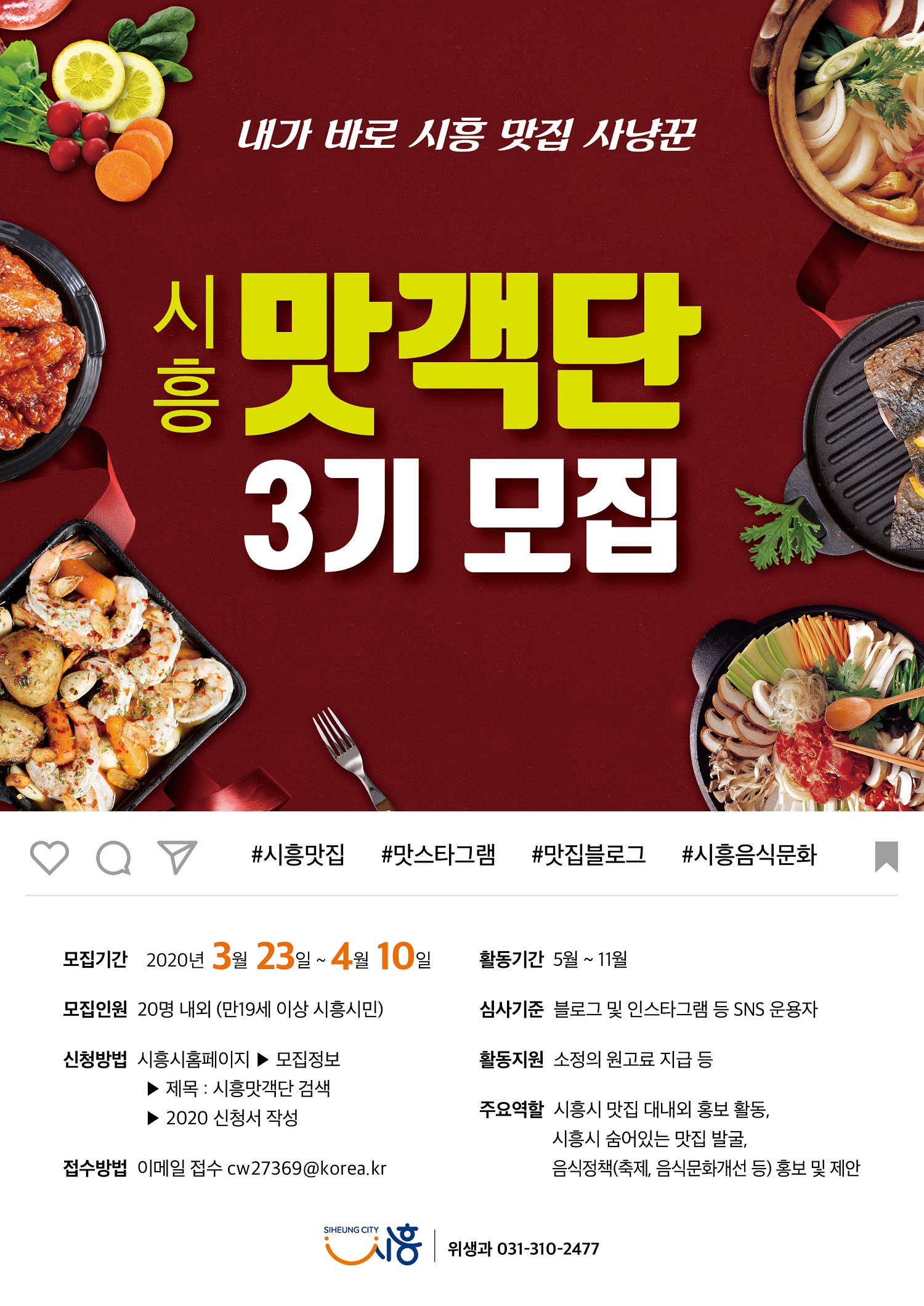 지원 자격은 평소 지역의 음식문화에 관심을 갖고 개인 블로그 등 SNS 채널을 활발히 운영하는 만 19세 이상 시흥시민이다.