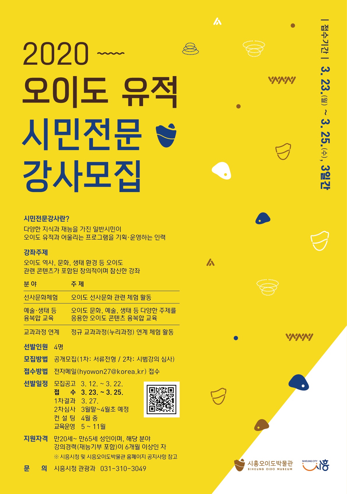 모집 관련 자세한 내용은 시흥오이도박물관 홈페이지(http://oidomuseum.siheung.go.kr) 공지사항의 <2020 오이도 유적 시민전문강사 모집> 글을 참고하면 된다.