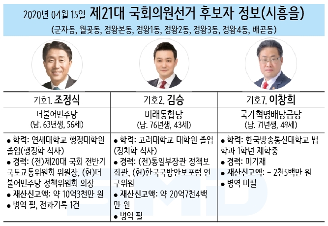 시흥을(군자동, 월곶동, 정왕본동, 정왕1동, 정왕2동, 정왕3동, 정왕4동, 배곧동) 지역은 기호1. [더불어민주당] 조정식 후보, 기호2. [미래통합당] 김승 후보, 기호7. [국가혁명배당금당] 이창희 후보 등 3명의 후보가 유권자들의 표를 받을 예정이다.