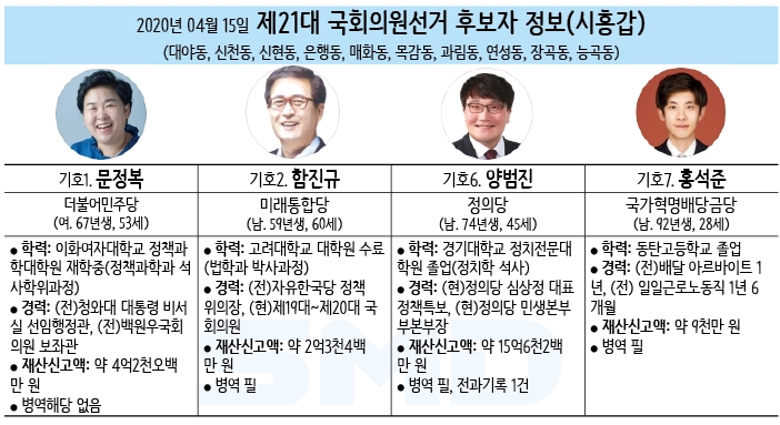 시흥갑(대야동, 신천동, 신현동, 은행동, 매화동, 목감동, 과림동, 연성동, 장곡동, 능곡동) 지역에는 기호1. [더불어민주당] 문정복 후보와 기호2. [미래통합당] 함진규 후보, 기호6. [정의당] 양범진 후보, 기호7. [국가혁명배당금당] 홍석준 후보 등 4명의 후보가 국회 진출을 겨룬다.