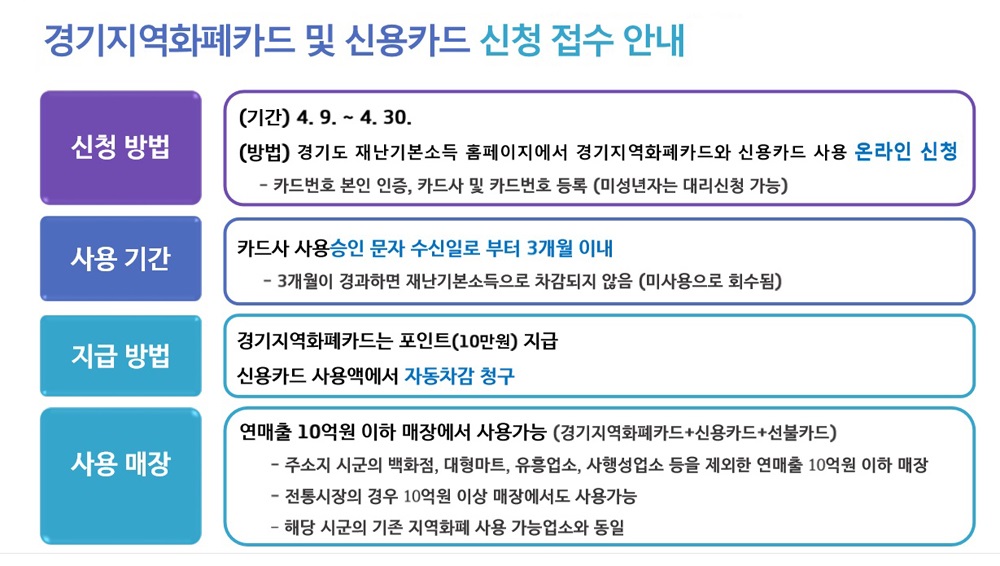 지급 방식은 자신이 사용하는 경기지역화폐카드나 신용카드를 이용해도 되고, 카드가 없는 사람은 가까운 읍·면·동 행정복지센터 또는 농협 지점을 찾아 선불카드를 신청해도 된다. 어렵거나 불편해서 경기도 재난기본소득을 받지 못하는 일이 없도록 하겠다는 것이 경기도의 설명이다.
