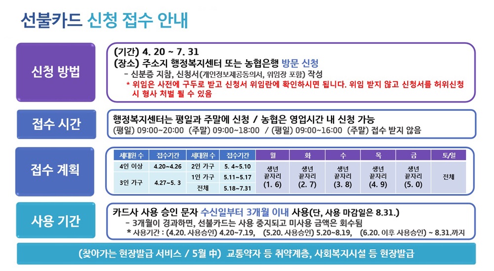 해당 주 대상자 중 선불카드를 신청하지 못한 도민은 토요일과 일요일 읍·면·동 행정복지센터에서 신청하면 된다. 주말뿐만 아니라 직장인을 배려해 주중에 행정복지센터는 오후 8시까지, 토요일과 일요일은 오전 9시부터 오후 6시까지 신청을 받는다. 농협 지점은 평일 오전 9시부터 오후 4시까지 신청 가능하다. 이후 5월 18일 이후부터는 가구수 관계없이 평일 정상 업무시간 내에 읍면동 행정복지센터나 농협에서 발급받을 수 있다.