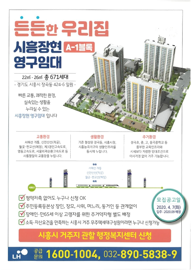 시흥시(시장 임병택)는 시흥장현 A-1블록 영구임대주택의 입주자 671세대를 오는 20일(월)부터 23일(수)까지 3일동안 신청을 받는다.