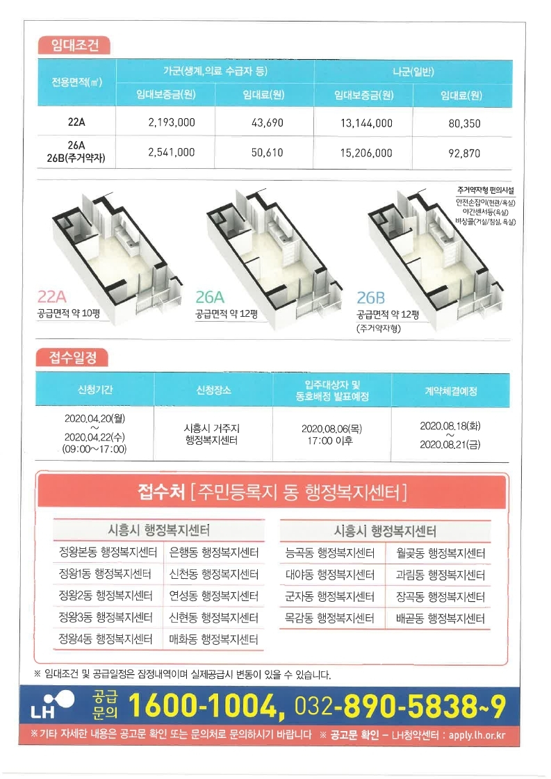 이번에 공급되는 주택은 22A, 26A, 26B(주거약자)로 총 3가지 타입이 공급된다. 가군(생계, 의료 수급자 등)의 경우, 22A타입은 임대보증금 2,193,000원, 임대료 43,690원이며, 26A 및 26B타입의 경우 임대보증금 2,541,000원, 임대료 50,610원에 공급될 예정이다.