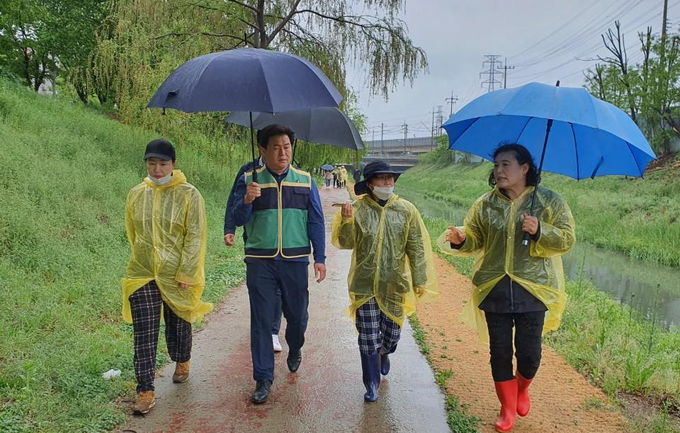 임병택 시장이 9일(토) 오전, 비가 오는 데도 불구하고 시흥천을 방문해 정왕본동 환경지킴이(이하, 지킴이) 봉사단을 격려했다. 오인열 의원(다 선거구), 성창열 정왕본동장과 함께 한 임 시장은 생금집(향토유적 제7호)에서 출발해 바람개비 이정표가 안내하는 시흥천을 걸으며 주변을 둘러보았다.