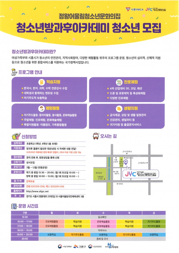 정왕동 일대의 한부모·다문화·다자녀·맞벌이 가정 등 방과 후 돌봄이 필요한 초등학교 5~6학년 청소년을 대상으로 모집하며 평일에는 오후 4시부터 저녁 8시까지 운영하고 월 1회는 주말체험활동을 실시한다.