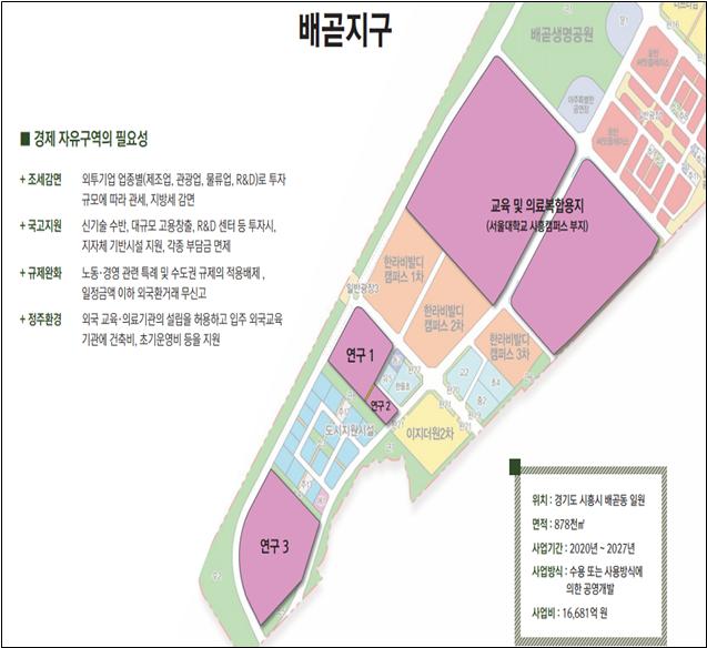 이번에 경제자유구역으로 지정된 시흥 배곧지구(0.88㎢)는 서울대 시흥스마트캠퍼스, 시흥배곧서울대병원 등 산‧학‧연 연계에 유리한 앵커 시설이 들어서고, 주변에 시화MTV 및 시흥스마트허브 등과 함께 산업활동의 집적지로 개발이 가능한 큰 장점을 가지고 있는 지역으로, 교통과 물류, 사람이 모이는 수도권 유일의 신성장 거점으로 성장할 것으로 기대된다.