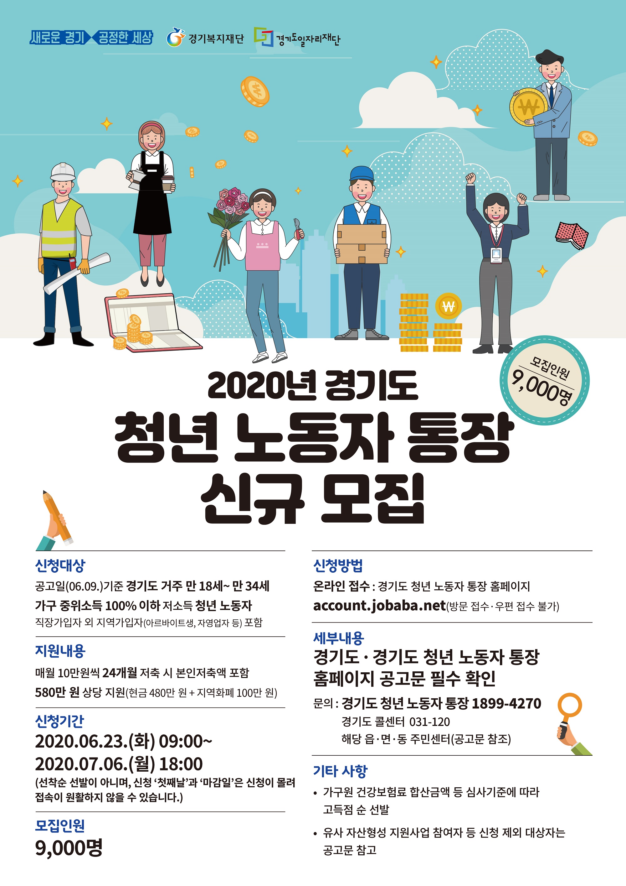 ‘경기도 청년 노동자 통장’은 청년이 매월 10만원을 저축하고 24개월 동안 근로활동을 유지할 경우, 경기도 지원금과 이자 등을 합쳐 2년 후 약 580만원의 목돈을 마련할 수 있는 청년 지원 사업이다.