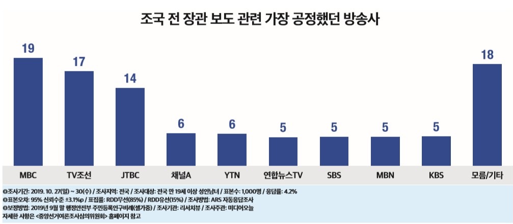 '조국정국' 보고 가장 공정했던 방송사 1위 MBC, 2위 TV조선