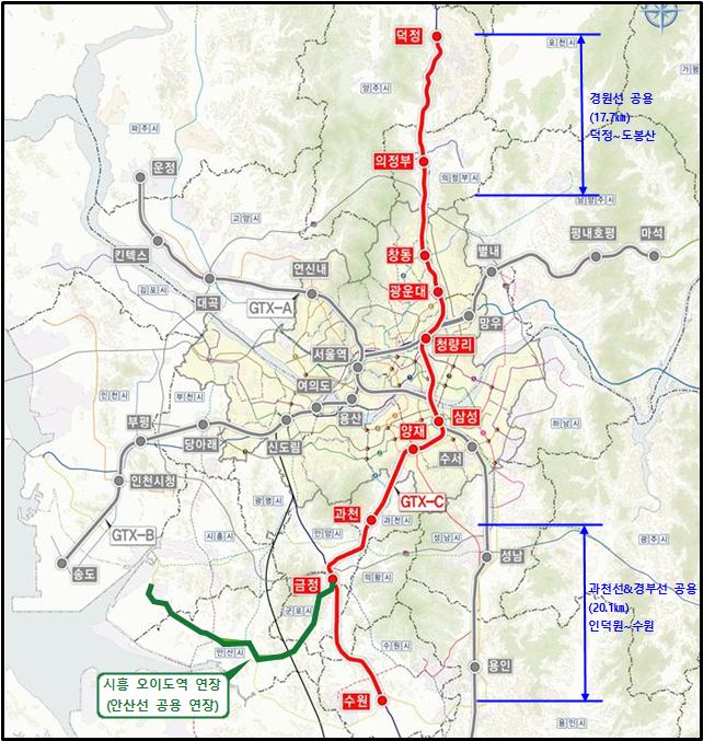 수도권 광역급행철도인 GTX-C 노선은 덕정~의정부~양재~과천~금정~수원 등 수도권 서남권 및 북부권을 서울(강남)과 연계하는 철도다. 총 연장 74.2㎞ 중 36.4㎞를 신설하고, 37.8㎞는 경원선, 과천선, 경부선 등 기존 선로를 공용하도록 계획하고 있다.