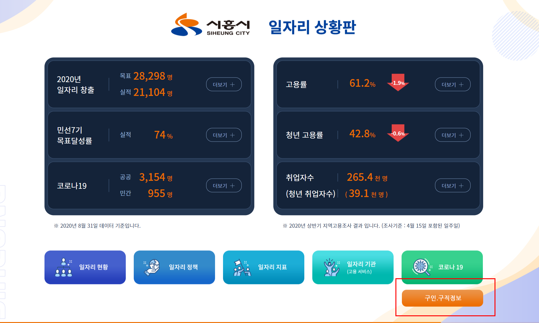 ‘시흥시 일자리상황판’(http://jobdashboard.siheung.go.kr/#self)에서는 ▲경제활동인구, 취업자 수, 고용률 및 실업률 등을 포함 총 16개 고용지표의 변화 추이 ▲재정일자리 사업과 코로나19 대응 일자리 사업 추진상황 ▲시흥시 일자리기관들의 고용서비스 현황이 제공된다.