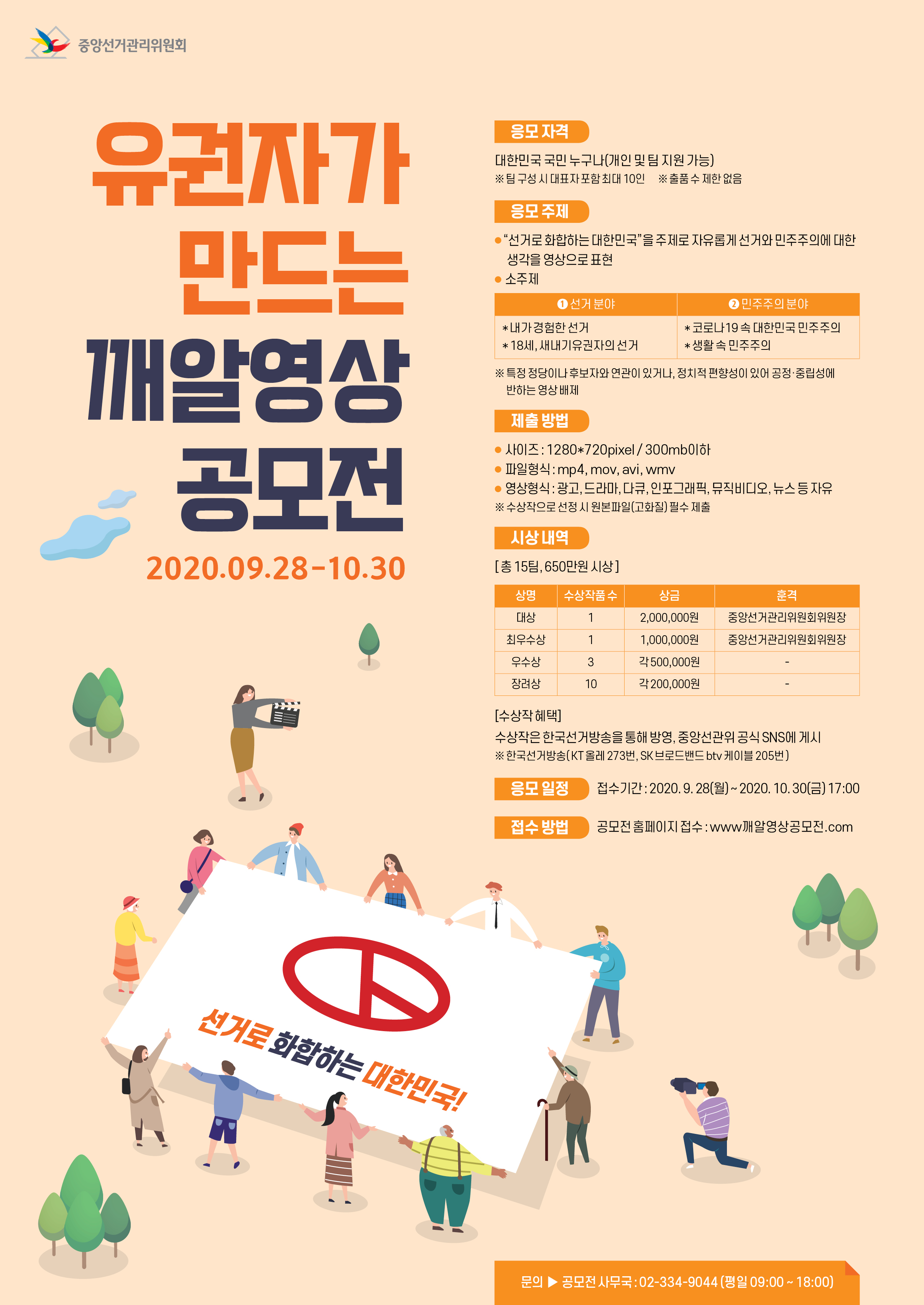 ‘선거로 화합하는 대한민국’을 주제로 ▲선거(내가 경험한 선거, 18세 새내기 유권자의 선거), ▲민주주의(코로나19 속 대한민국 민주주의, 생활 속 민주주의) 분야에 누구나 응모할 수 있으며, 홈페이지(www.깨알영상공모전.com)를 통해 9월 28일부터 10월 30일 17시까지 접수한다.