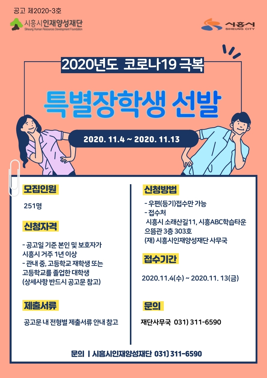 (재)시흥시인재양성재단(이사장 임병택)은 2020년 11월 4일부터 11월 13일까지(10일간) 2020년도 코로나19 극복 특별장학생 선발을 위한 접수를 진행한다.
