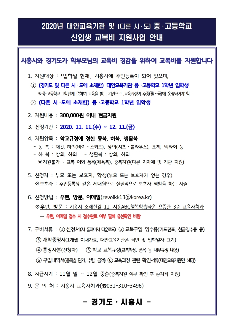 이번 지원 사업은 ‘입학일 현재’ 시흥시에 주민등록이 되어있는 학생 중에 (경기도 및  타 시·도에 소재한)교복을 입는 대안교육기관과 (타 시·도에 소재한)중·고등학교 1학년 입학생을 대상으로 교복비를 30만원 이내 현금 지원한다.