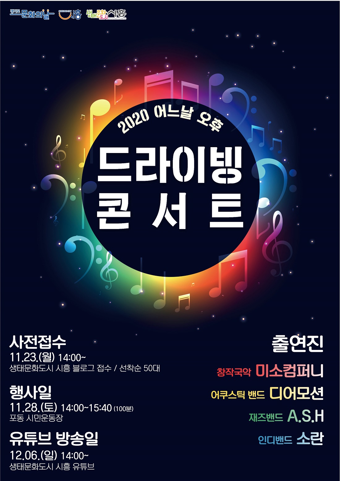 ‘드라이빙 콘서트’에 사전 접수하지 못하더라도 <생태문화도시 시흥 유튜브> 채널에서 더 완성도 높은 녹화 영상을 관람할 수 있다. 온라인 영상은 12월 6일 오후 2시부터 24시간동안 송출될 예정이다.