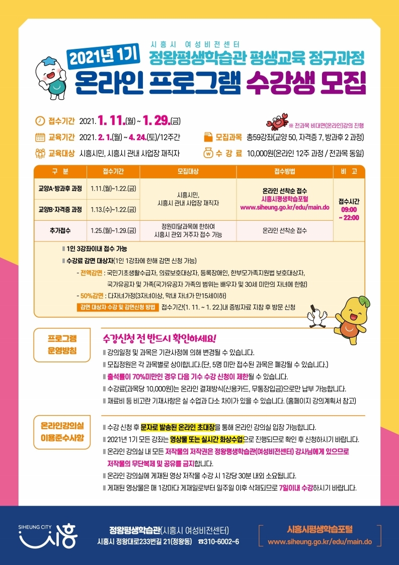 ‘시흥시여성비전센터’가 ‘정왕평생학습관’으로 명칭을 변경하고 1기 정규과정 온라인프로그램 수강생을 모집한다.