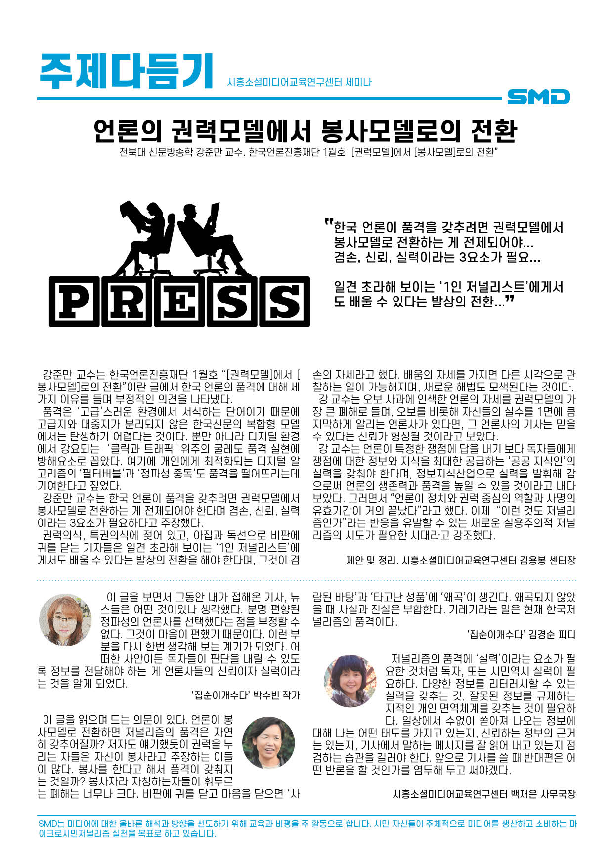 저널리즘의 품격에 ‘실력’이라는 요소가 필요한 것처럼 독자, 또는 시민 역시 실력이 필요하다. 다양한 정보를 리터러시할 수 있는 실력을 갖추는 것, 잘못된 정보를 규제하는 지적인 개인 면역체계를 갖추는 것이 필요하다. 일상에서 수없이 쏟아져 나오는 정보에 대해 나는 어떤 태도를 가지고 있는지, 신뢰하는 정보의 근거는 있는지, 기사에서 말하는 메시지를 잘 읽어 내고 있는지 점검하는 습관을 길러야 한다. 앞으로 기사를 쓸 때 반대편은 어떤 반론을 할 것인가를 염두해 두고 써야겠다.