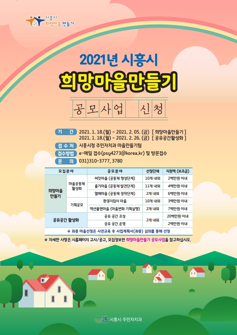 시흥시(시장 임병택)는 마을공동체를 통해 함께 위기를 극복하기 위한 『2021년 희망마을 만들기 공모사업』을 추진한다.