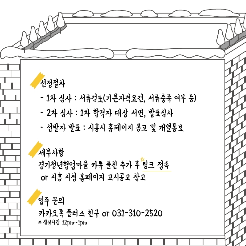 입주모집 관련 내용은 시흥시청 홈페이지에서 확인하거나 청년협업마을 카카오톡 채널 혹은 청년청소년과(031-310-2520)로 문의하면 된다.