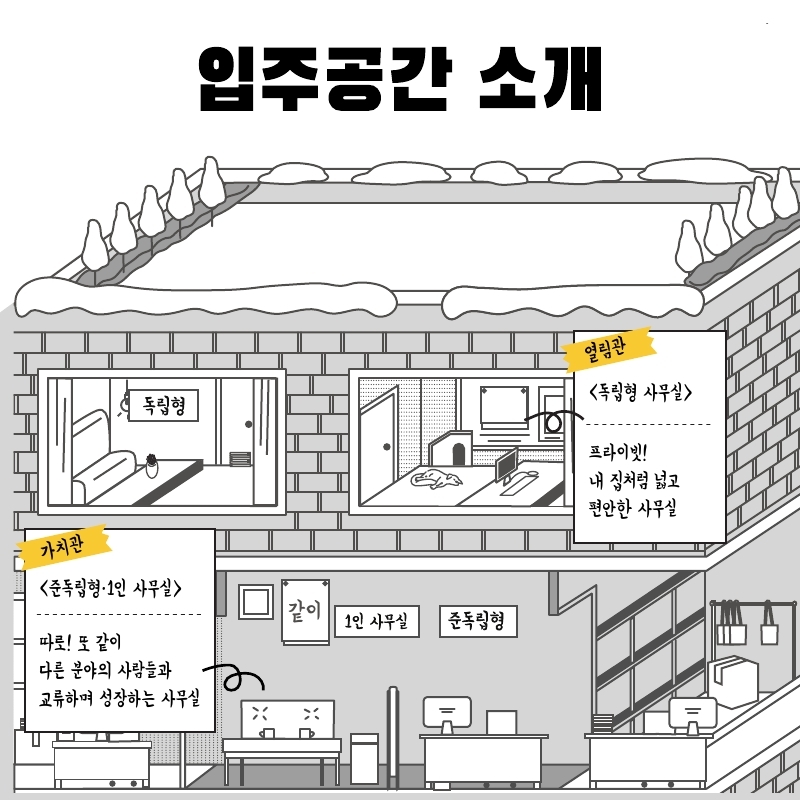 준독립형·1인 입주공간은 한 층에 기업별로 사무공간이 구분되어 있으며 회의실, 작업실 등 입주자 전용 공용공간을 함께 이용할 수 있어 자연스럽게 교류할 수 있다는 장점이 있다.