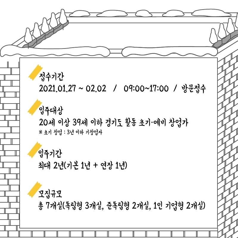이번 2021년 상반기 모집은 총 26개의 입주 공간 중 열림관 독립형 사무실 3개실과 가치관 준독립형 사무실 2개실, 1인 공간 2개실이 대상이며, 경기도 20세 이상 39세 이하 청년은 입주신청을 할 수 있다.